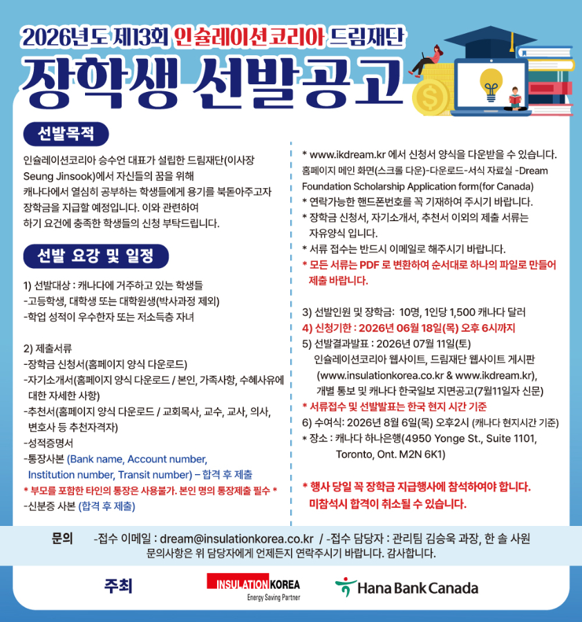 2026년도 인슐레이션코리아 드림재단 캐나다 장학생 선발공고
