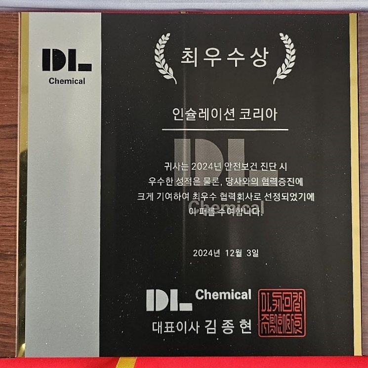 Insulation Korea has been awarded the “Grand Prize” for site safety by DL Chemical in 2024.
